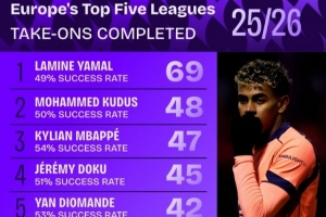 本赛季五大联赛过人榜:亚马尔断崖领跑,姆巴佩、多库在列