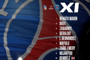 巴黎首发:1-雷纳托·马林、2-大卫·博利、6-扎巴尔尼、4-贝拉尔多、3-卢卡斯·埃尔南德斯、7-马尤卢、8-扎伊尔·埃梅里、5-恩贾恩图、10-登贝莱、9-贡萨洛·拉莫斯、11-杜埃