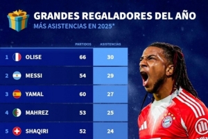 体育资讯12月25日讯 德国转会市场统计了球员2025年俱乐部+国家队的助攻次数,并列出榜单,奥利塞30助居首,梅西29助次席。