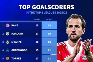 本赛季五大联赛射手榜:凯恩、哈兰德19球居首,姆巴佩18球