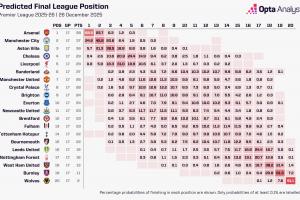 Opta预测英超:枪手夺冠概率68.5%第1曼城第2,狼队降级概率99.9%