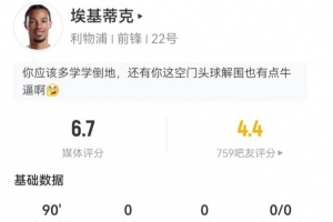 体育资讯1月2日讯 利物浦在本轮英超0-0战平利兹联,埃基蒂克本场数据如下: