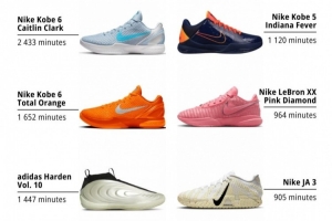排名第一的是凯特琳·克拉克的PE配色Kobe 6 Protro,上脚时长为2433分钟;