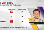 湖人今天上半场的43分有39分都来自东契奇得分&助攻