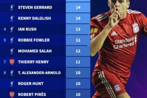 阿森纳、利物浦交锋参与进球数:菲米、杰拉德、达格利什14球居首