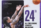 德罗赞今天高效砍下33分,在NBA历史得分榜上超越英格拉仕,排名第24